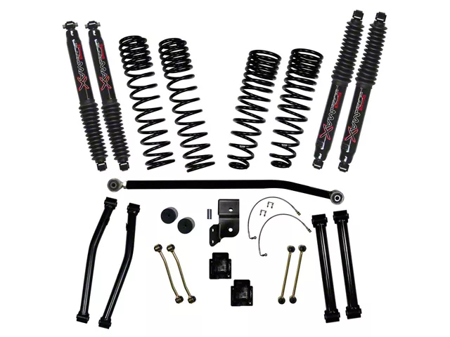 Performance Boost. Improve your Gladiator’s off-road capabilities without compromising comfort and handling. Upgrade to the SkyJacker 4.50-Inch Dual Rate Long Travel Suspension Lift Kit with 3-Inch Rear Coil Springs and Black MAX Shocks to install larger tire and wheel combos in preparation for more adventurous rides. This kit is engineered to enable your Jeep to conquer all-terrain obstacles with ease and confidence.