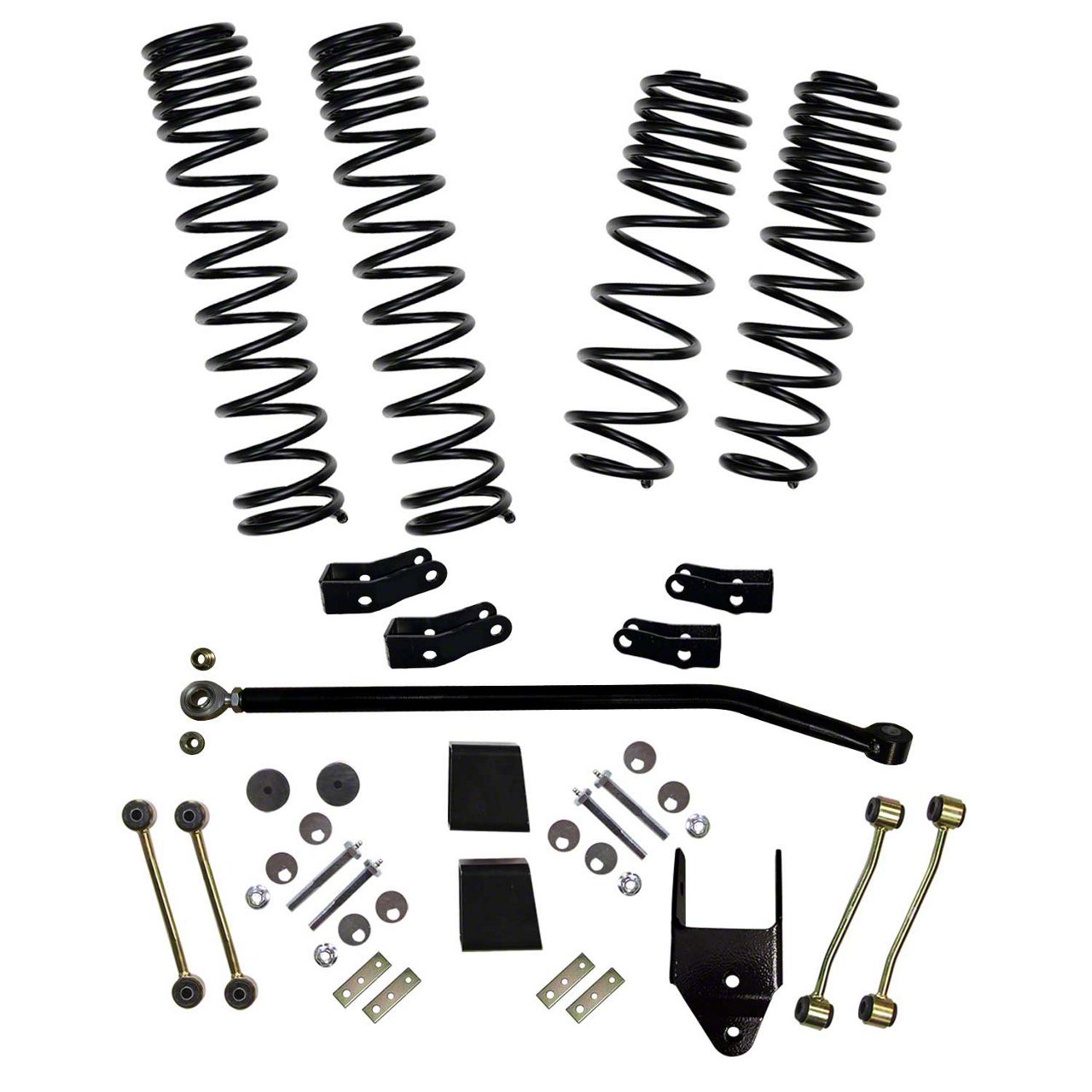 Construction and Appearance. This lift kit is finished in glossy black, providing a sleek, high-quality appearance that matches the rugged aesthetics of the Jeep Wrangler. The components are engineered for durability and long-lasting performance, featuring stock style rubber bushings and robust track bar brackets. The design not only improves the vehicle’s visual appeal but also its functional resilience against rough terrains.