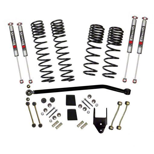 The biggest determining factors in ride quality and suspension performance are coil springs and shocks. Skyjacker specifically engineered a progressive 2-stage dual rate long travel coil. Spring rate progression is from a 1st Flex Rate to a 2nd Ride Rate.The 1st Flex Rate stage delivers a comfortable ride with the ability to flex for increased articulation. The flex rate expands during full articulation as the suspension drops (full droop). This keeps the coil springs seated in the upper coil mount/bucket and the tires in contact with the terrain. The 2nd Ride Rate stage only engages after compression past the flex rate. Engineered to coordinate with the Wrangler’s distinctive suspension handling characteristics, the rear coils are side specific.Shocks are a key link in-between the chassis and your suspension. Their key role is to dampen out or control the terrain to keep your tires in contact with the terrain.Front damper capacity enhanced with M95 Monotube Shocks. M95 Shocks have specific valving and stroke for this application. The high-pressure nitrogen gas and Internal Floating Piston technology combine to create the most rapid responding shock ever. The replacement Front Adjustable Track Bar includes Skyjacker installed pressed-in HD OEM style rubber bushing and an adjustable 3/4-inch Heavy-Duty Rod End, Jam Nut and Alignment Bushings. A heavy duty Rear Track Bar Upper Mount Bracket is included to center the axle under the vehicle properly.Front and Rear Bump Stop Spacers bolt onto the axle bump pads and keep the suspension travel safely in check. Front and Rear Extended Length Sway Bar End Links allow full articulation as the suspension drops (full droop). These sway bar end links include Skyjacker installed pressed-in HD OEM style rubber bushings.