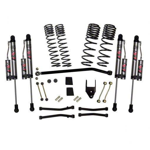 Performance And Versatility. The SkyJacker 4.50-Inch Dual Rate Long Travel Suspension Lift Kit with ADX 2.0 Remote Reservoir Shocks elevates your Jeep Wrangler JL Rubicon 4xe with improved off-road performance and enhanced tire clearance. This system allows for full articulation and supports the factory coil springs, delivering optimal handling while navigating rugged terrains.