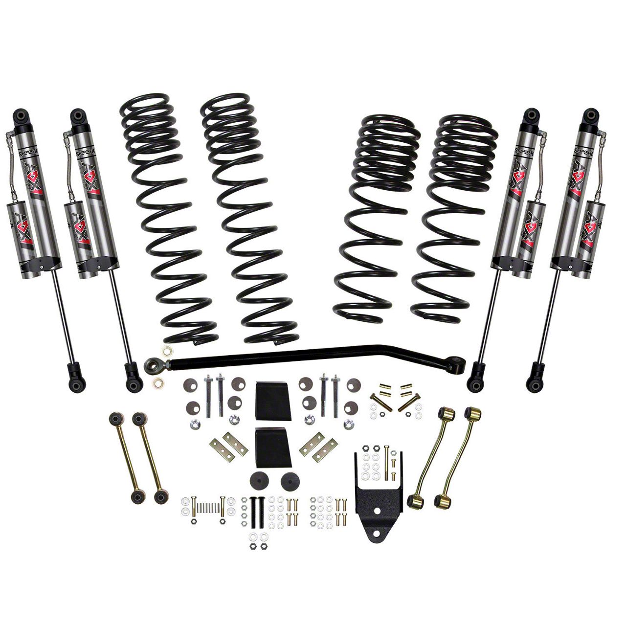 Dual Rate Long Travel Model. Made for the 3.0L EcoDiesel Jeep Wrangler JL 4-Door models, excluding Rubicon models, this SkyJacker Suspension Lift Kit comes in a glossy black and polished chrome finish. Built as a dual rate long travel model that gives a solid lift of 4 inches, this suspension lift kit includes ADX 2.0 remote reservoir shocks, coil springs, track bar, track bar bracket, brake line brackets, bump stop spacers, cam bolts, and sway bar end links for an all-in-one installation.