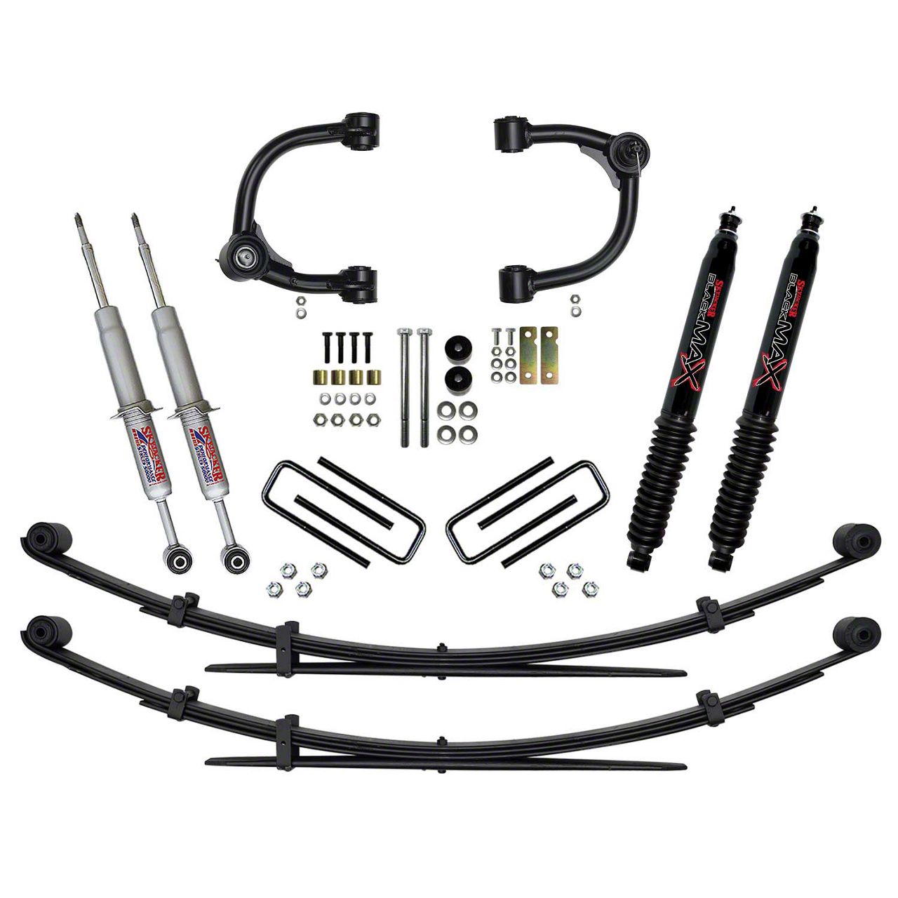Tough Terrain Handling. Experience a smooth and comfortable ride, even on the toughest terrains. The SkyJacker Lift Kit includes Rear Leaf Springs and Black MAX Shocks, providing exceptional shock absorption and improved handling. Tackle any off-road adventure with confidence, knowing your vehicle offers a comfortable and controlled driving experience.