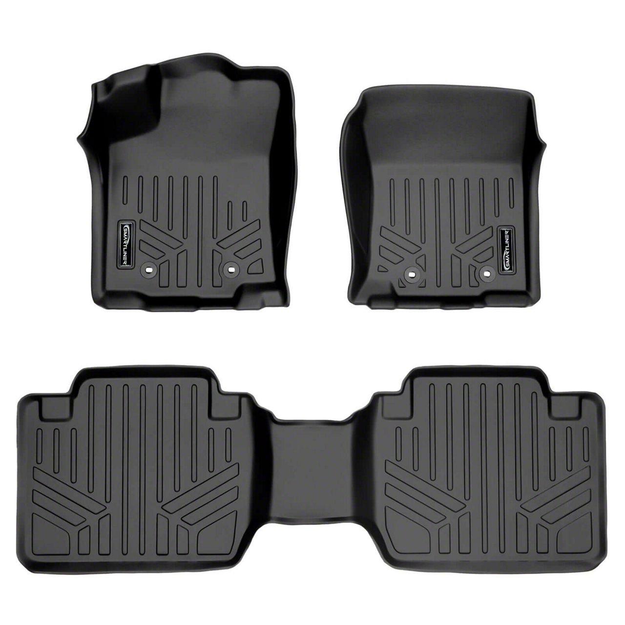 Construction and Appearance. Crafted from eco-friendly, recyclable materials, these liners pair flexible resilience with long-term durability for year-round use. The matte black finish presents a clean, factory-like look that hides scuffs between washes, while carefully contoured edges and channeling support all-weather protection by trapping liquids and debris away from carpet. The front and rear layout is engineered to follow floor geometry closely, and the surface texture works with Firm Grip technology to steady footing in wet or dusty conditions.