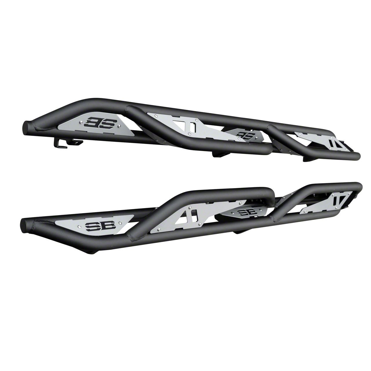 Construction and Appearance. Constructed from heavy-duty steel, these rock sliders are designed for maximum durability and impact resistance. The textured black powder-coated finish enhances protection against rust and corrosion, ensuring long-lasting performance in harsh environments.