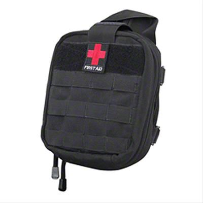 Orderly Arrangement. This first aid storage bag attaches to your Bronco's roll bar in 3 different locations for a secure mounting placement. The bag comes manufactured from durable black material construction and includes strap and snap buckle for an easy attachment. The bag's individual storage compartments allow for an orderly arrangement of your first aid items.