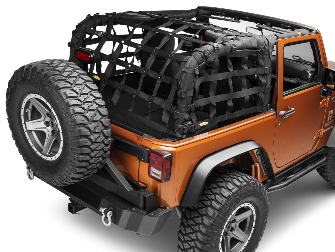 High Strength Cargo Keeper. Spreading a net of polyester webbing over the rear section of your 2007-2018 JK Wrangler, the Smittybilt C-RES2 Cargo Restraint System ensures nothing will fly out matter how big a rut or stone you hit. Reaching from the sound bar to the tailgate, this cargo minute also covers the sides and is suitable for use with either hardtop or soft top jeeps. The net tensile strength is 1,200 lbs, ensuring that even heavy objects won't tear through it if they go flying when you hit an obstacle. The net does not interfere with hardtop or soft top mounting points, so you can leave it on rather than needing to take it off every time you switch from an open to a closed configuration.