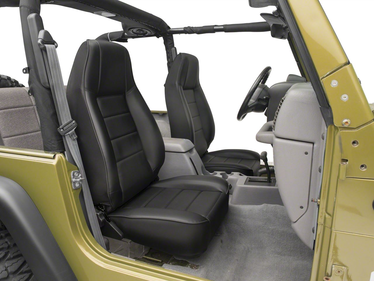 Function. Smittybilt offers these high quality, OEM style replacement seats so you can refresh your Jeep's interior. This seat is upholstered with black denim around a powder coated, tubular frame, and features a dual recline mechanism that ensures they will fit on either the driver or passenger side.