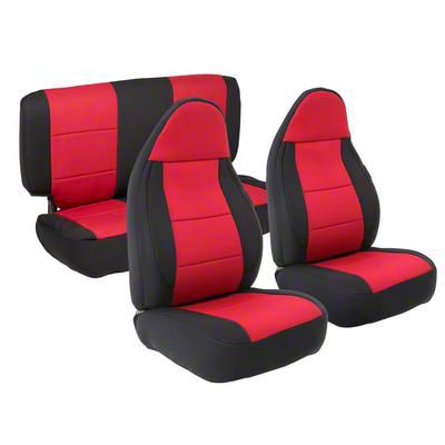 Easy Protection. Cover up your Jeep's old, worn out and faded factory seats with the Smittybilt Neoprene Seat Cover Set Front & Rear in Red. Designed specifically for your TJ or LJ, this front and rear seat cover set installs easily for a fresh look and extra protection from dirt, mud and every day spills.
