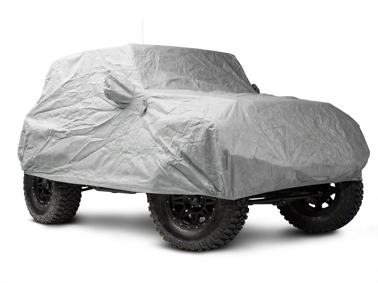 Quality Construction. Smittybilt manufactures their Full Climate Cover from a space-age fabric that protects your vehicle's exterior from the elements, while allowing the paint to breathe. The unique diamond bond pattern allows trapped air and moisture to escape preventing paint damage. The Covers spun bond polypropylene layer repels water, while providing protection against heat buildup and ultra violet light.