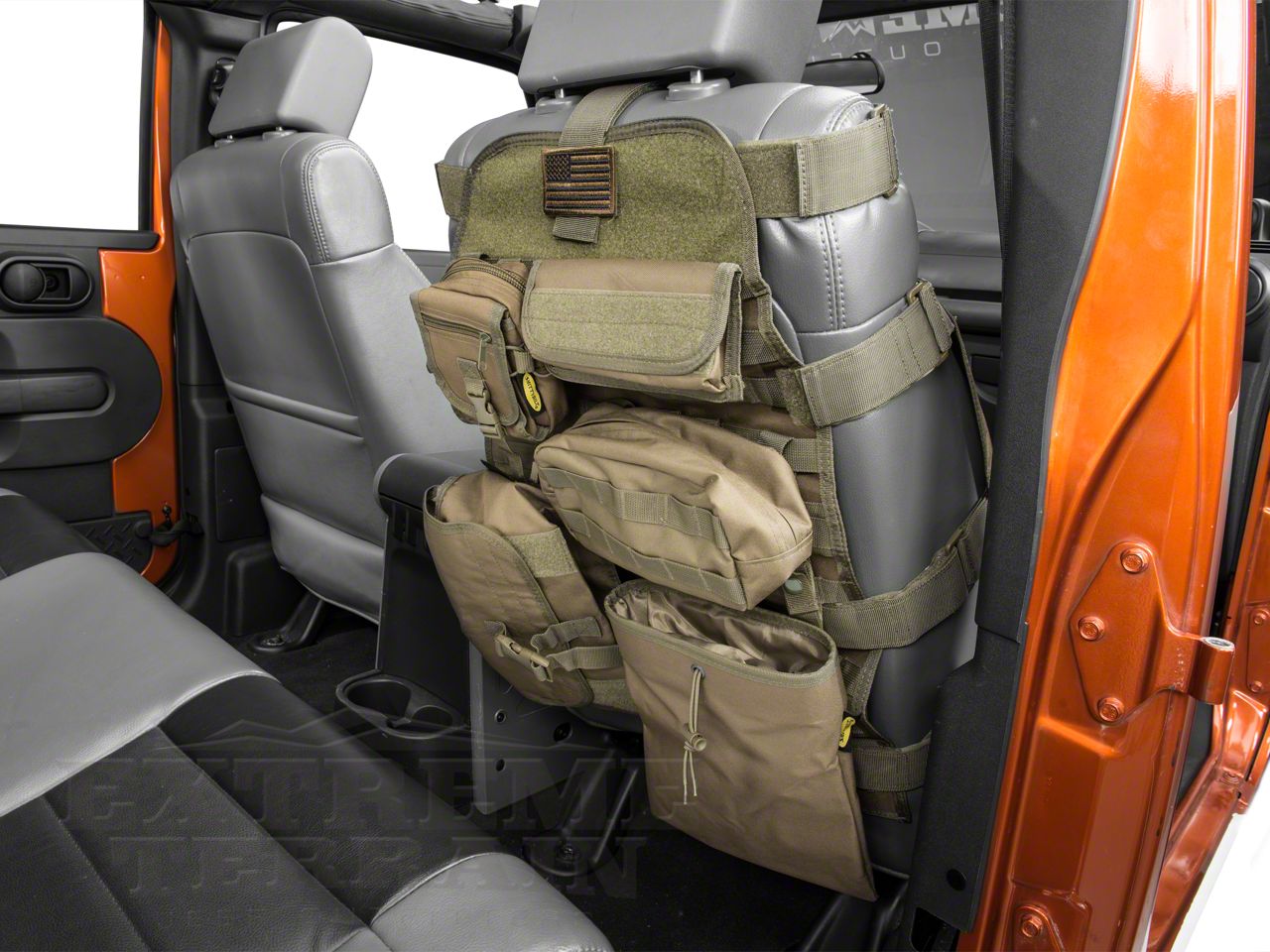 Key Features. Jeeps were born in the military, so they wear this military-inspired G.E.A.R. Front Seat Cover incredibly well. The modification adds to the rugged, utilitarian look of your rig, plus it's incredibly functional. Seven pockets are included on the cover, including small convenient pouches on the sides and front of the cover. The Molle/Pals Restraint System is designed to keep all of the pockets firmly closed, no matter what, so you won't have gear go flying during some rough riding on a trail. The polyester material used for the cover is made to be durable and resist fading for the long haul, matching the tough nature of your Jeep.