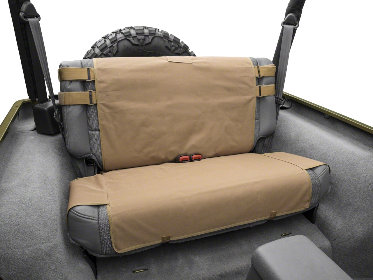Specs. The coyote Tan G.E.A.R. Rear Seat Cover by Smittybilt enables you to protect your Wrangler's back seat from water and dirt, and also add some extra cargo storage at the same time. This quality product is made out of 600 denier polyester fabric with a PVC liner. The fabric and the dyes that color it are both designed to be UV (ultraviolet) stable, remaining supple and resisting fading even after long periods in the direct sun. This tough seat cover includes Velcro fasteners to ensure that it stays where it is supposed to be and does not slip off the seat.