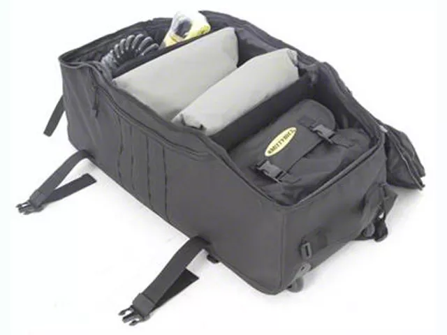 Secure & Out of Sight. This bag features extremely durable 600 Denier black ballistic nylon construction, along with padded shoulder and backpack straps. It also has Easy-Go roller wheels which make moving it from one location to another easy and convenient. It can be secured in the back of your Wrangler for those bumpy rides using the integrated tie-down points and its hideaway rain cover will keep it out of sight when you need it to be.