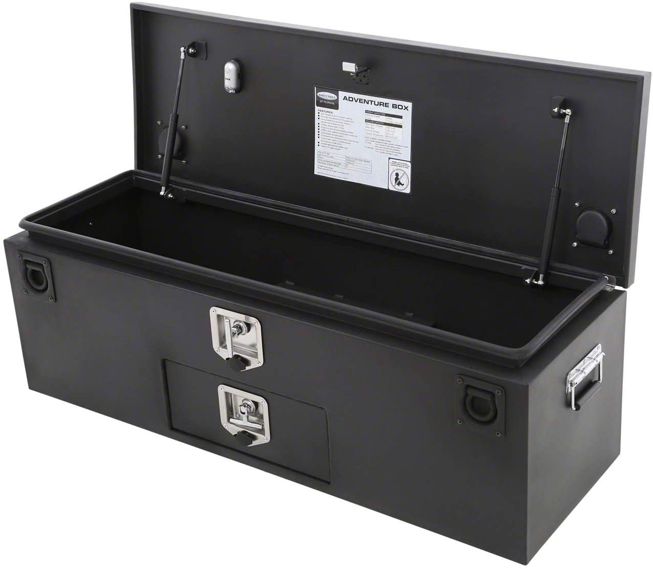 Impressive and Convenient Storage. Add a durable locking and secure storage system in your Jeep Gladiator to keep your expensive tools and outdoor gear. This Smittybilt Adventure Storage Box offers the perfect combination of theft prevention, ease of accessibility, and value. It features integrated side handles and retractable D-ring mounts that provide multiple options for mobility and mounting. The top lid utilizes gas-charged struts, so you can easily open the box without the lid closing down while you access the contents inside. Moreover, this storage system comes fully lockable for efficient, secure loading and unloading.