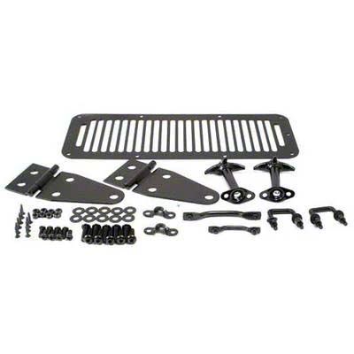 Construction and Features. Crafted from high-quality stainless steel, this hood kit is designed for durability and style. The matte black finish provides a rugged, sleek look, and with occasional waxing, it maintains a mirror-like shine for years. The included components—hood catches, hinges, a windshield tie-down kit, and hood vent—are all designed to fit perfectly, giving your Jeep a stylish and functional upgrade.