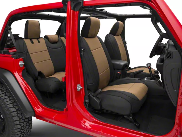 Application. These Smittybilt Custom-Fit Tan Neoprene Front and Rear Seat Covers are intended for use on 2018-2024 Jeep Wrangler JL 4-Door, excluding Rubicon models.