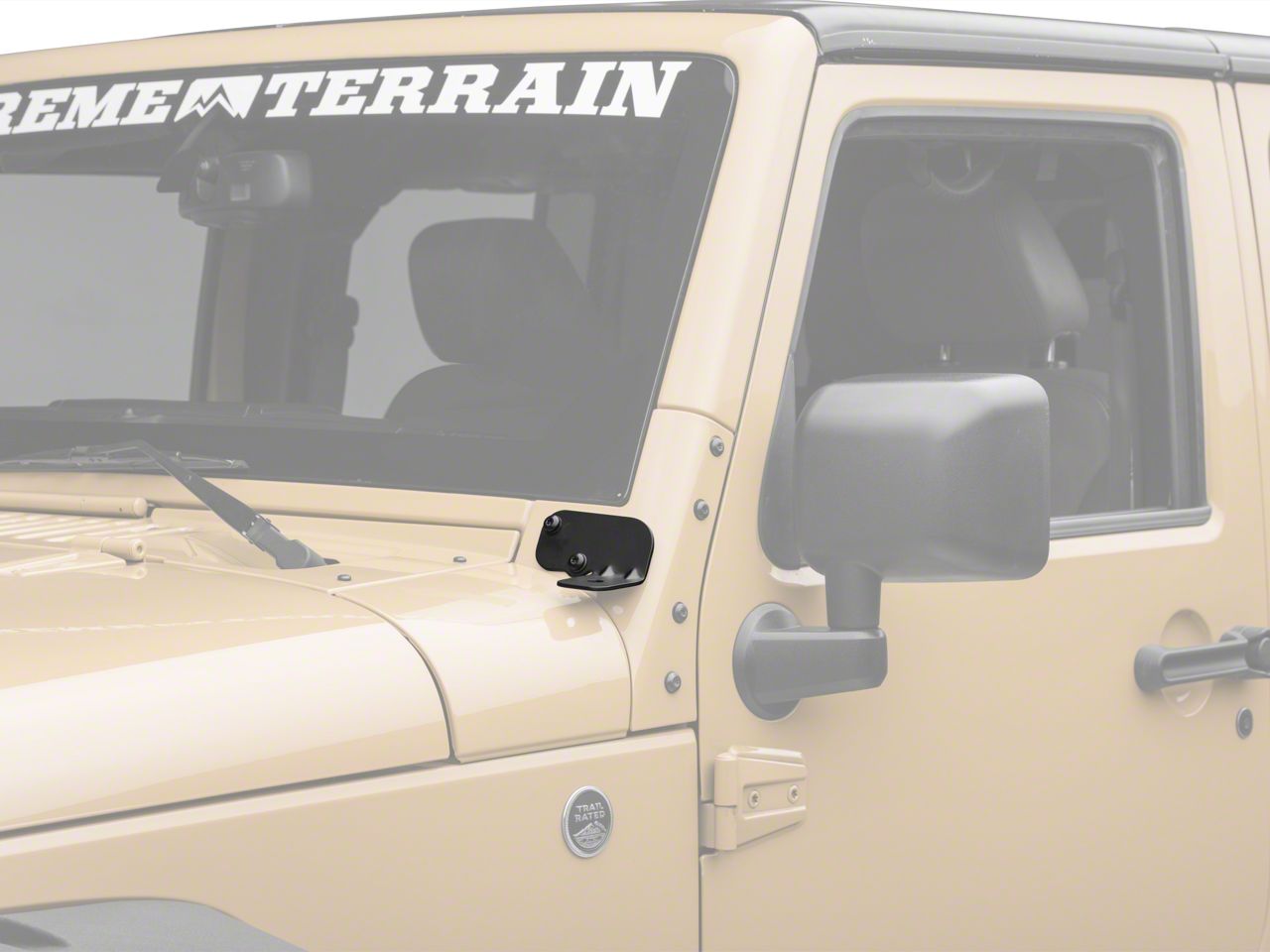 Forward Light Mount. Getting some extra light without interfering with forward visibility in your 2007-2018 Jeep Wrangler JK is what the Smittybilt Black Windshield Hinge Bracket Light Mount allows, creating a pair of mounting points for lamps at the bottom corners of your Jeep's windshield.
