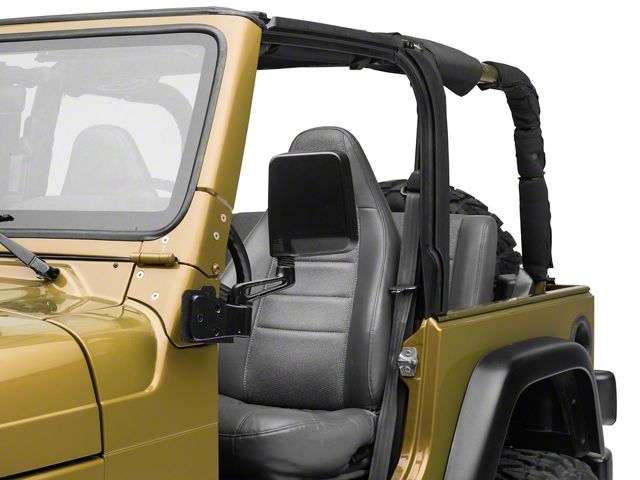 Construction. Upgrading from hard doors to soft doors doesn't have to mean getting rid of your mirrors. Stay street legal by remounting your original mirrors from your steel doors to your new soft doors. Piggy back your original mirrors with these brackets which work with mirrors that originally mounted to your doors. They measure 8 inches by 4 inches by 6 inches. The kit includes 2 mirror relocation brackets and all the installation hardware you need.