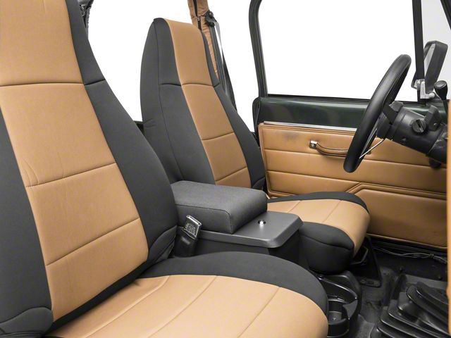 Specs. The Smittybilt security floor console measures 12 inches tall by 9 inches wide by 22 inches long, and fits into the space between the front seats of 1976-1995 Jeep CJ5, CJ7 and Wrangler YJ Models. The lockable security compartment provides ample storage space for valuables; keys are included. 2 cup holders at the front of the console are adjustable to hold various sizes of drinks conveniently, eliminating the risk of spills. The console is available in 3 colors, Black Denim, Gray Denim, and Spice Denim (brown).