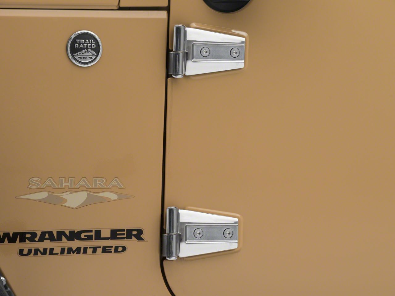 Application. These Smittybilt Stainless Steel Door Hinges fit 2007-2018 Jeep Wrangler JK models. Front and Rear Hinges are identical and can therefore be ordered using the same part number. Sold as a set of 4.