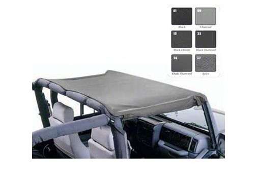 Quality Construction. Smittybilt's standard brief top in black denim is custom made to fit 1992 - 1995 YJ Wranglers. It is made from durable, weather resistant, outdoor grade polymer cloth. The design utilizes a strap free look as well as a tight fit to help reduce flapping. While giving you the benefit of open air that Jeep enthusiasts adore, the standard top protects the driver and front seat passenger from the sun and random showers. No tools are required here. This brief top fastens to the center roll bar and windshield, and only weighs 3 pounds.