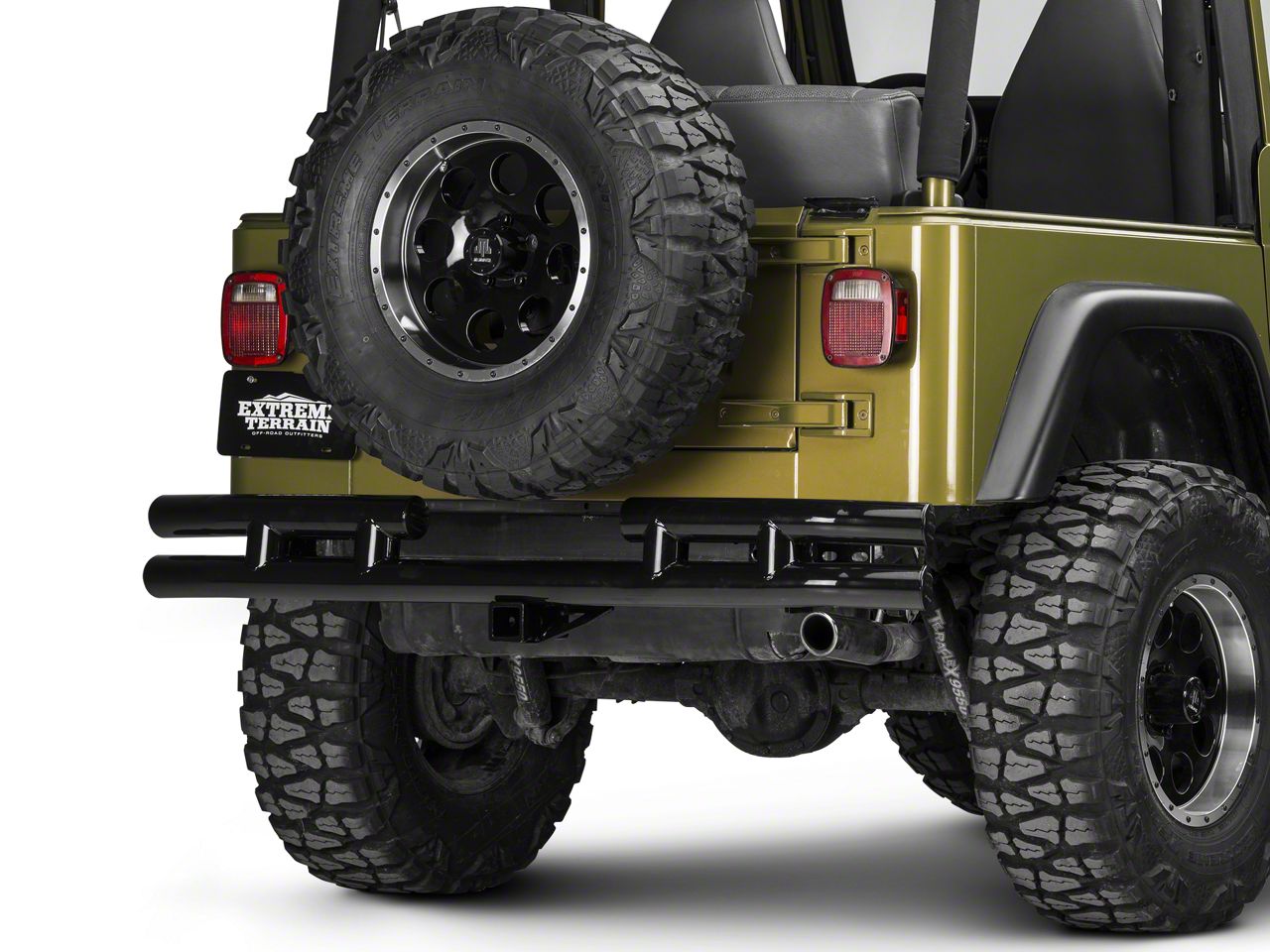 Classy Appearance. Improve the look of your Wrangler with this classy Smittybilt Tubular rear bumper. The bumper is polished to a black glossy mirror coat and it looks very nice while being pretty understated in design. The tubular-style bumper is low-profile and very sturdy in construction. Add it to your Jeep and make it a stronger vehicle overall.