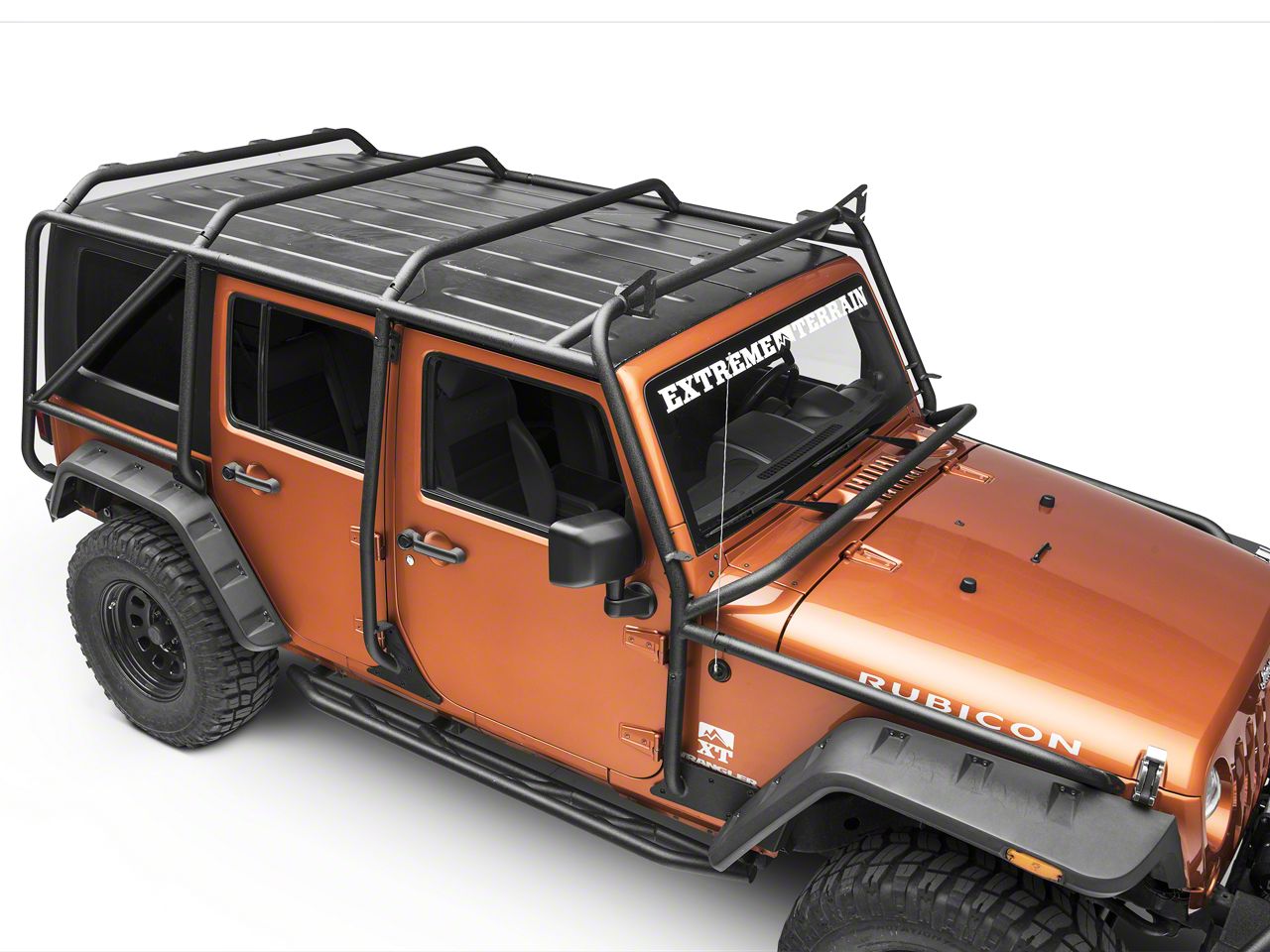 Steel Tubing. Smittybilt's XRC Exoskeleton features thick 1.75 in. diameter, 0.120-wall steel tubing that provides superior strength and durability. A black powder coat finish provides excellent wear resistance, while a lightweight design (just 150 pounds) minimizes the exoskeleton's effects on handling and performance. The thoughtful design also includes 14 touch points for better rigidity, a windshield crossbar so roof access isn't cut off, and 4 crossbars for mounting a rack or tent.