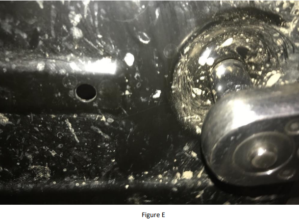 4. Remove the bottom bolt of the evap canister using a 13mm socket wrench (Figure E). Keep this bolt for installing the new skid plate.