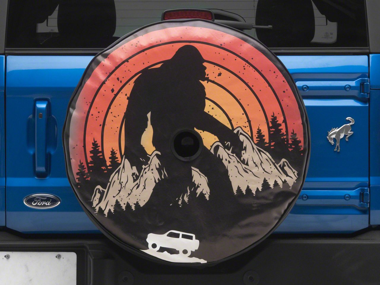Application. This Sasquatch Bronco Vintage Retro Spare Tire Cover fits all 2021-2025 Ford Bronco Models.