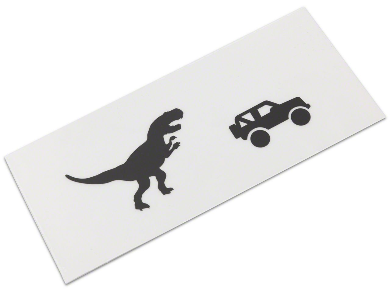T-Rex Silhouette Decal. This humorous decal shows the silhouette of a Tyrannosaurus Rex, better known as a T-Rex, chasing after an all-terrain vehicle. This T-Rex Decal measures 6 x 2.2 inches and can be applied to any smooth flat surface and looks especially good in your rear/side windows or on your tailgate.