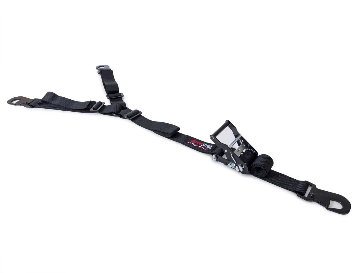 This 3pt Spare Tire Tie-Down is great for UTV and smaller size Buggy, Jeep, or Truck tires. Each end of this 3-point spare tire tie-down is fully adjustable to allow the center point and ratchet to be positioned right where you want it. Constructed of 1.75" nylon material, a deluxe wide grip ratchet, and flat snap hooks. This tie-down is the perfect size for standard UTV and ATV tires (approx tire size 26"- 38"). Assembled in the USAAvailable with Twisted Hooks on all three ends