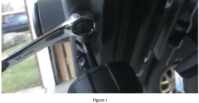 11. Using a 15mm socket wrench, loosen the bolts and slide the mount so that each is at least 6" apart from each center (Figure J). Tighten down bolts.