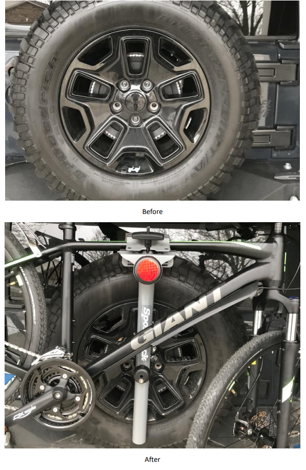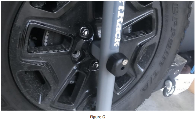 8. Reinstall the mounting tube onto the spare tire mounting mechanism by screwing the screw-in knob back on (Figure G).
