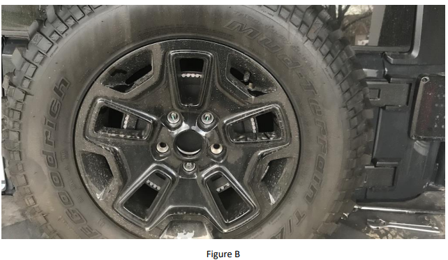 3. Unscrew the three lug nuts on the spare tire using a 19mm socket wrench (Figure B).