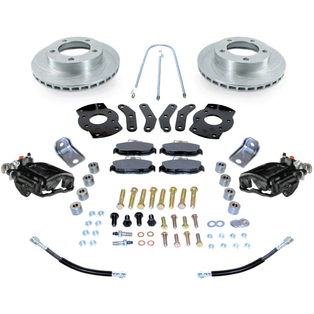 This kit contains all the parts you need to convert your 1976-1986 Jeep CJ7, one- piece rear axle with automatic or manual transmission from drum to disc brakes. Manufactured from quality materials, these rear conversion kits are designed to bolt directly onto your stock axle and provide you with the performance and durability you expect from a modern brake system. Please consult the wheel fitment diagram to confirm clearances and contact our customer service/technical support at 1-716-775-6700 for assistance.