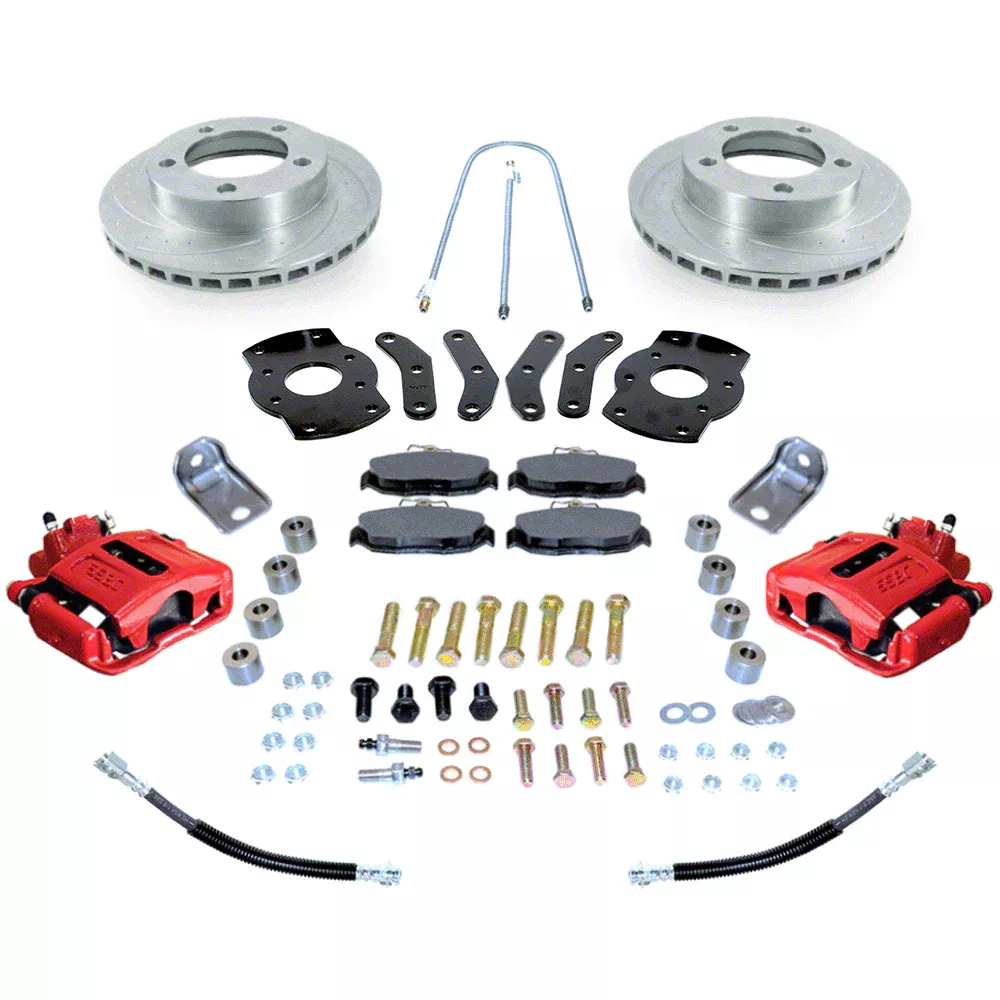 Rear Disc Brake Conversion. The SSBC-USA Rear Disc Brake Conversion Kit with Built-In Parking Brake Assembly and Dimple Drilled/Slotted Rotors; Red Calipers is designed to upgrade your vehicle�s rear drum brakes to a modern disc brake system. This kit improves braking performance, providing more reliable and efficient stopping power by replacing outdated drum brakes with advanced disc technology. It�s essential for enhancing safety and braking consistency under various driving conditions.