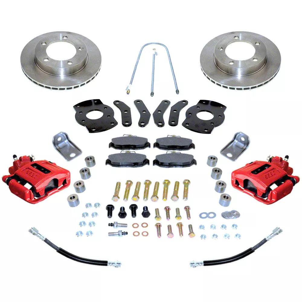 Rear Disc Brake Conversion. The SSBC-USA Rear Disc Brake Conversion Kit with Built-In Parking Brake Assembly and Dimple Drilled/Slotted Rotors; Red Calipers is designed to replace the stock drum brakes on the rear axle, enhancing braking performance and reliability. This kit provides a modern upgrade to the Jeep CJ7, delivering improved stopping power and integrated parking brake functionality.