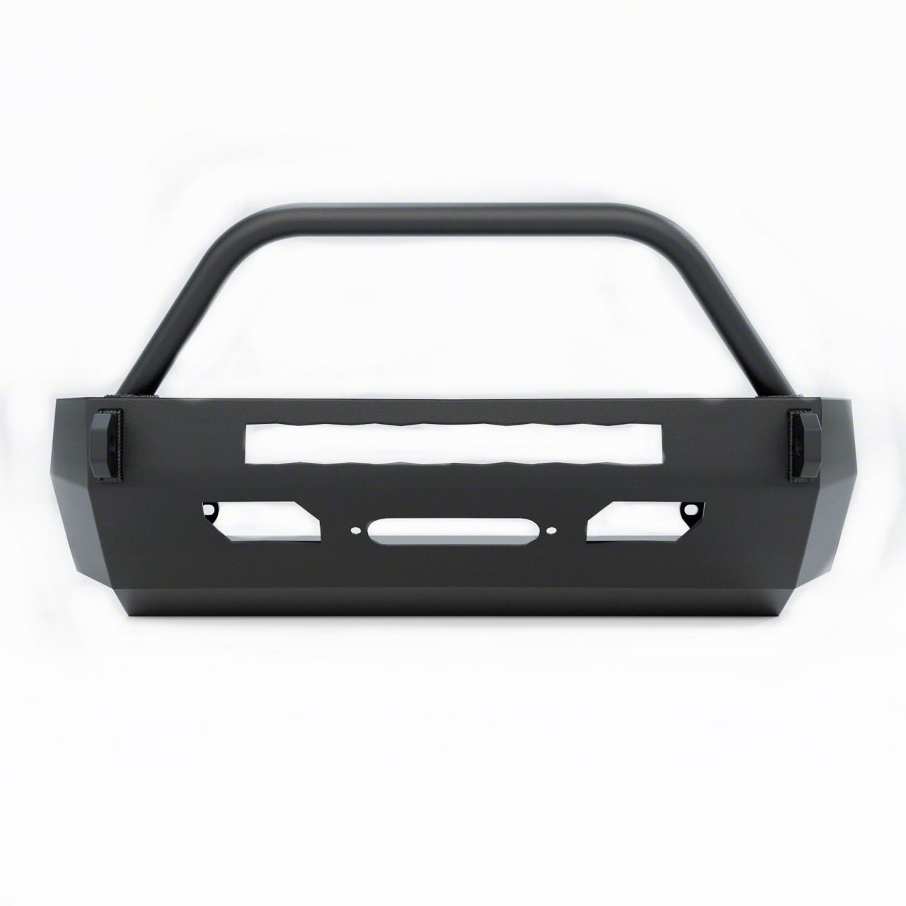 Construction and Appearance. Crafted from heavy-duty steel with a black powder coat finish, this slimline bumper is built for durability and long-lasting protection. The included bull bar adds an extra layer of defense for your vehicle's front end, while the sleek design maintains a low-profile look.
