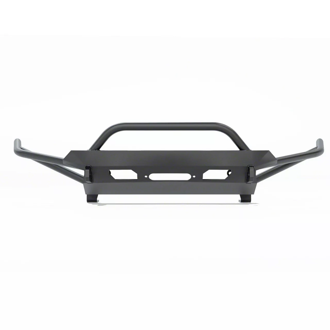 Construction and Features. Crafted from high-quality 1/8, 3/16, and 3/8-inch All-American steel, this bumper is built for maximum durability. The textured black finish offers a rugged appearance and corrosion resistance, ensuring long-lasting performance. Additionally, it is compatible with 10,000 to 12,000-pound winches, making it a practical choice for off-road recovery.