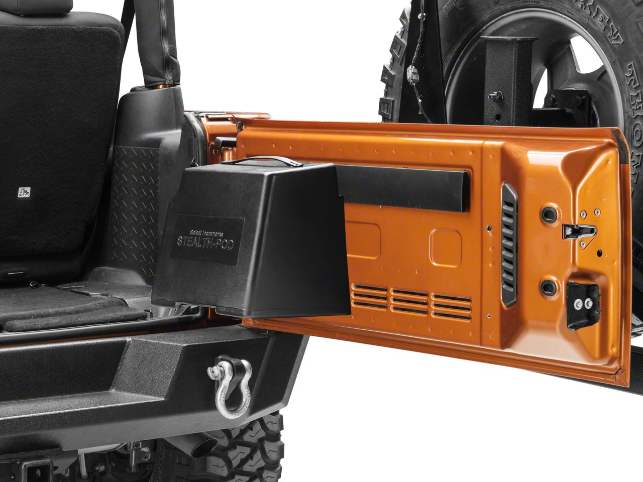 Installation. Swinging with the tailgate when you open it, the Stealth-Pod is isolated from your Wrangler’s structure by slotting into hangers rather than mounting directly to the tailgate. Rubber isolator pads cut down on vibrations even more. The whole Stealth-Pod unplugs and lifts out with a carrying handle so you can take it with you to avoid theft. Minor drilling to accommodate the hanger mounting bolts in the tailgate is required for installation.