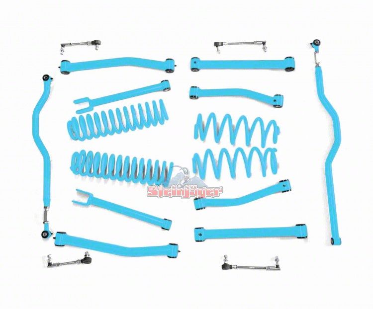 Tough Rugged Performance. If you frequently take your Wrangler JK on rocky or rough trails, it may be time to upgrade to a Steinjager 2.50 Inch Advanced Lift Kit in Playboy Blue. This complete lift kit delivers everything you need take on rugged terrain and serious trails, but it also excels in daily street driving. This provides a 2.50-inch high front and rear lift for better ground clearance.