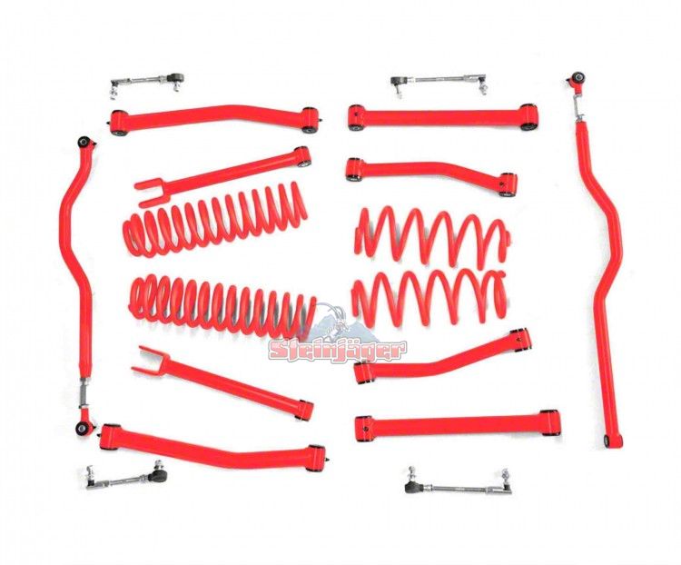 Hard-Working Coil Springs. Steinjager coil springs are used to lift the front and rear of your Wrangler efficiently. It has been engineered, valved, and tuned for intense off-road power while still providing a smooth highway ride. The striking Red Baron powder coat finish provides protection against corrosion while adding some good looks to your lift system.