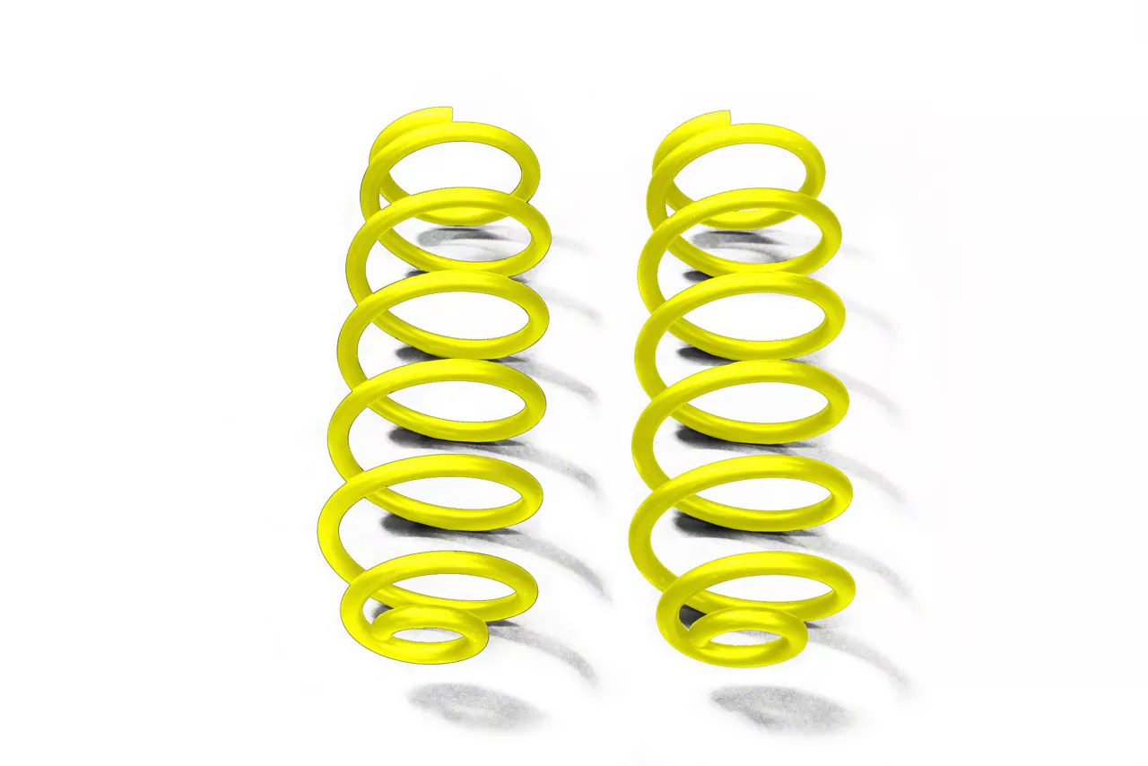 Sturdy Construction. These Rear Lift Coil Springs are built to withstand high-stress driving conditions and make you tackle the steep inclines and rocky trails with confidence. These springs are furnished with a Neon Yellow powder-coated finish for long-lasting resistance to the harsh elements. This pair also went through an intensive shot peening process to eliminate sagging and fatigue.