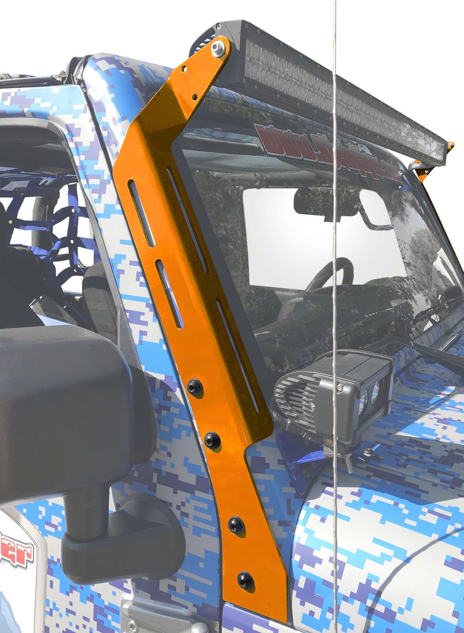 Application. The Fluorescent Orange Steinjager A-Pillar LED Light Mount Brackets are designed to fit 2007-2018 Jeep Wrangler JK models.