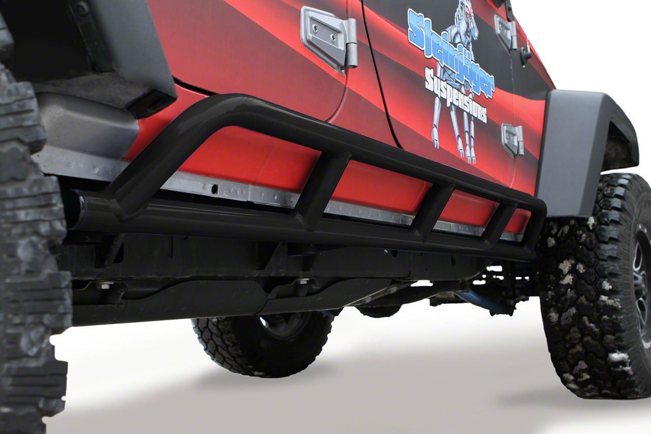 Application. The Steinjager Bare Metal Knuckles Rock Sliders is designed for use on all 2007-2018 4-Door Wrangler JKs.