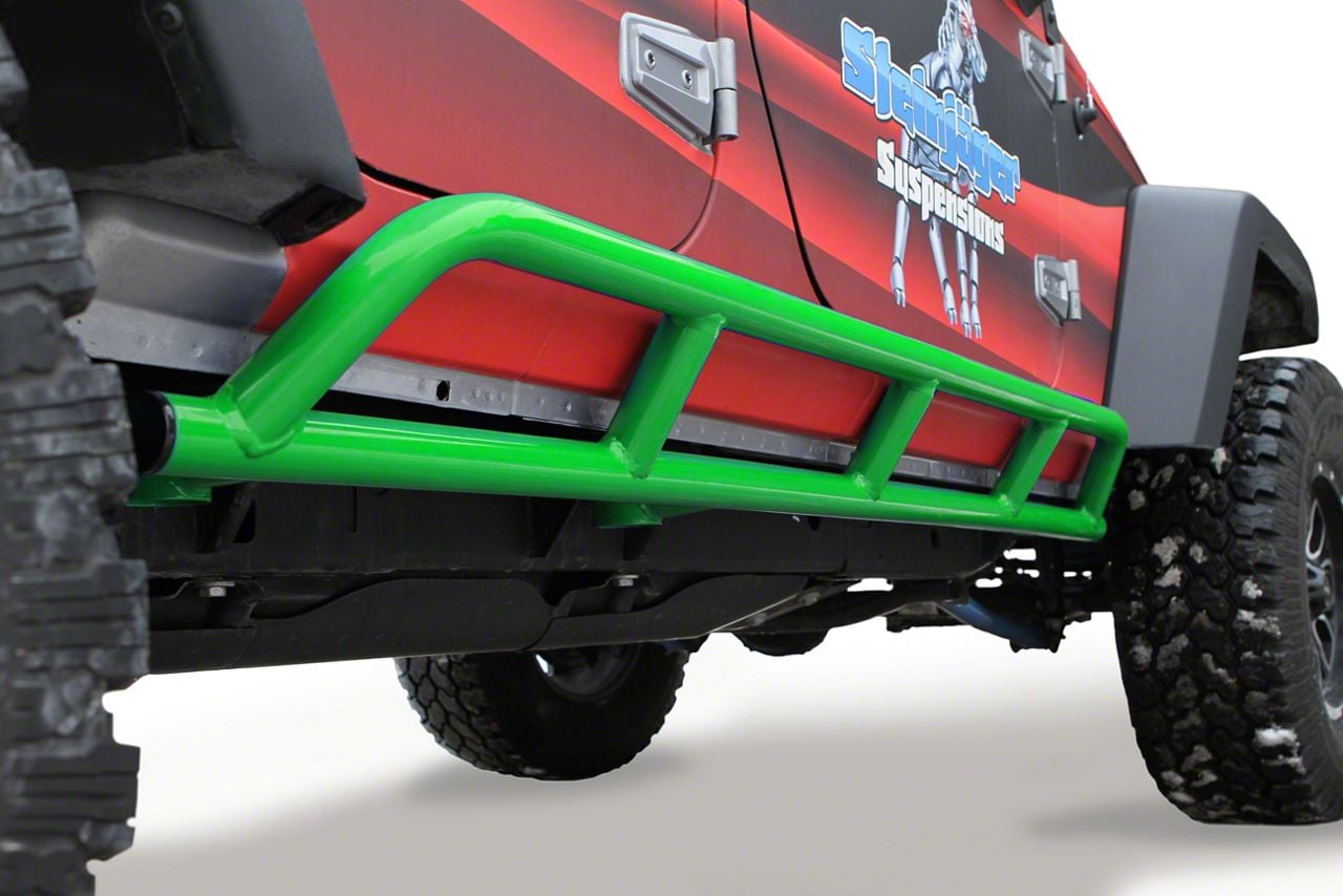 Application. This pair of neon green Steinjager Bare Metal Knuckles Rock Sliders is intended for 2007-2018 Jeep Wrangler JK 4-door models.