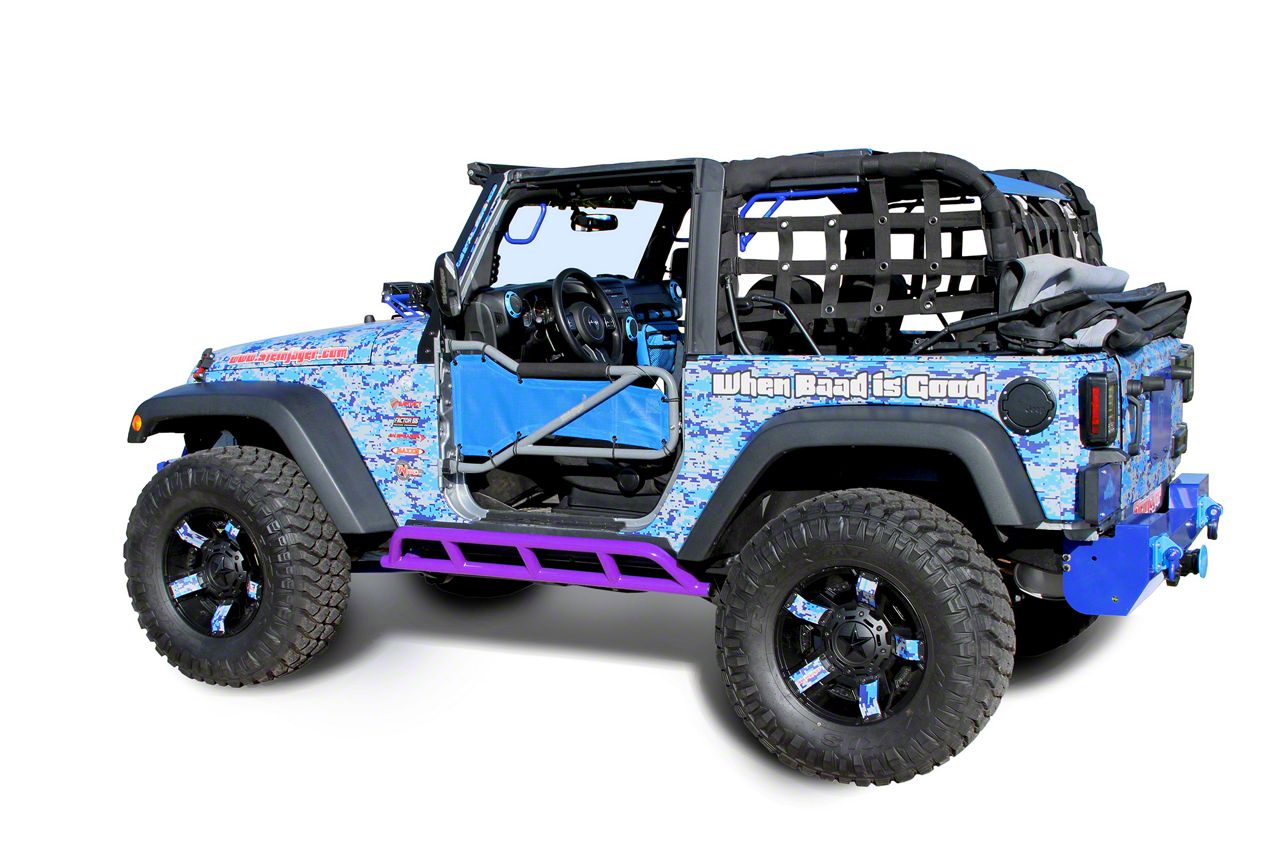Sturdy Construction. Bare Metal Knuckles Rock Sliders come in an eye-catching Sinbad Purple powder-coated finish, and are manufactured from 1.75 in. stainless steel tubing for extreme strength against the rugged outdoors. These heavy duty rock sliders fit on the left and right side of your Jeep’s body mount and are sold as a kit.