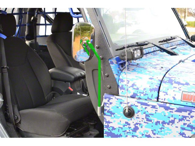 Street-Legal Mirrors. Taking down your doors compromises your Jeep’s street-legal status. By serving as a temporary replacement for your factory side mirrors, Steinjager Neon Green Door Hinge Mounted Mirrors keep your Jeep street-legal. These off-road side mirrors are especially helpful on your drive back home.