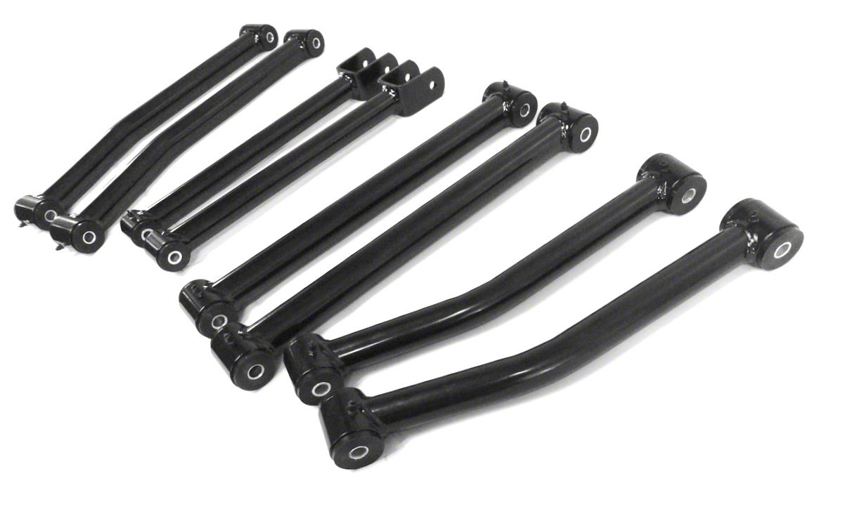 Sturdy Construction. This Steinjager Fixed Control Arms kit uses 1.5-inch diameter upper control arms and 1.75-inch diameter lower control arms that are made from DOM ASTM A513 Type 5 tubing for enhanced strength. A black powder coated finish offers longer lasting corrosion resistance. Control arms have greased poly ends for easy maintenance, and uses polyurethane bushings.