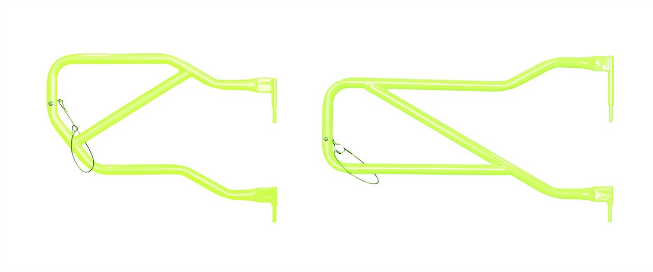 Rugged Construction. Steinjager Trail Tube Doors are crafted from tough 1.25 in. OD heavy duty cold-formed steel structural tubing grade C material. A cool Gecko Green powder coating ensures your tube doors are resistant to chipping, scratches, and fading due to outdoor exposure. Custom-machined door hinges allow for easy switching from your stock door to the tube door, while a quick release pin is attached to the door with a weather-resistant cable to ensure you don’t lose your door latch pin.
