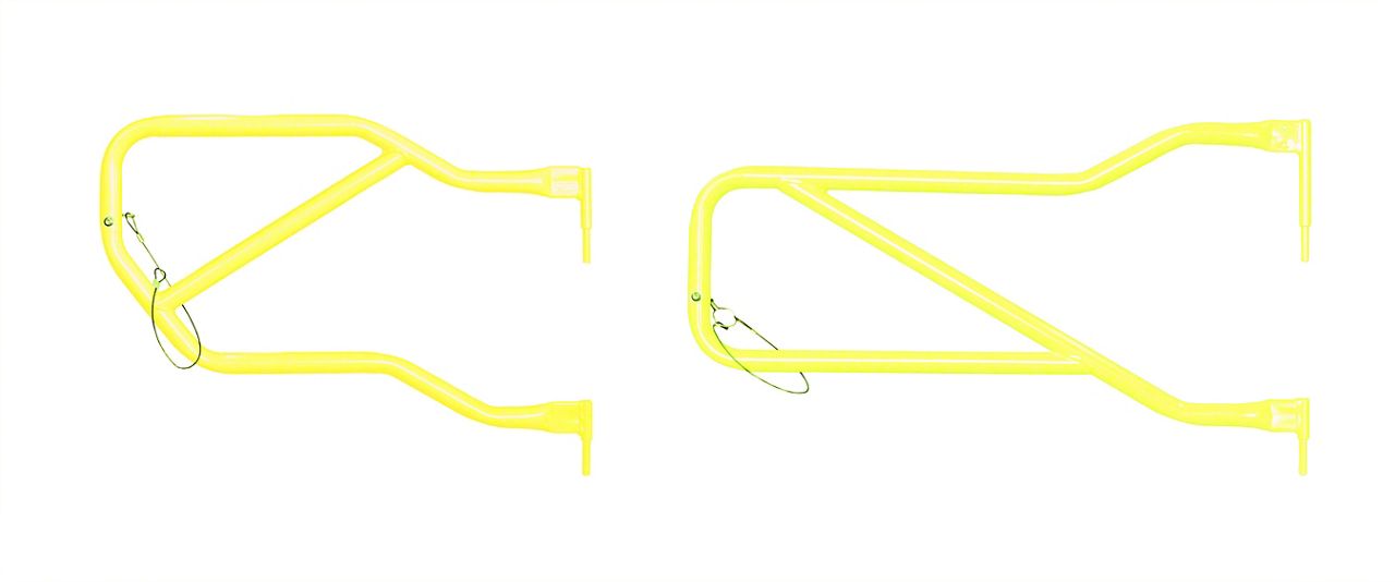 Sturdy Construction. Each Steinjager tube door is manufactured using Grade C cold-formed steel structural tubing that is 1.25 in. OD in size. A fade-, chip-, and scratch-resistant bright Neon Yellow powder coat finish adds a fun impact to your vehicle. A quick release pin is attached to the door with a weather-resistant cable to ensure you don’t lose your door latch pin.